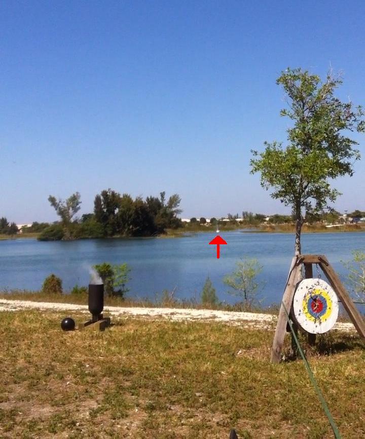 ball reached an altitude of 980 feet and was doing 180 MPH on impact with the lake. After this shot we cut the powder charge in half. The ball is very visible throughout its entire flight and, because of the finger holes, it whistles as it flies. The shot always ends with a very large and quite satisfying splash. The lake is a great target. We've never missed yet. Fun Fact: Solving the equation to determine the altitude of the 500 yard shot was used as a final exam question for an advanced physics class at a major Florida university. |